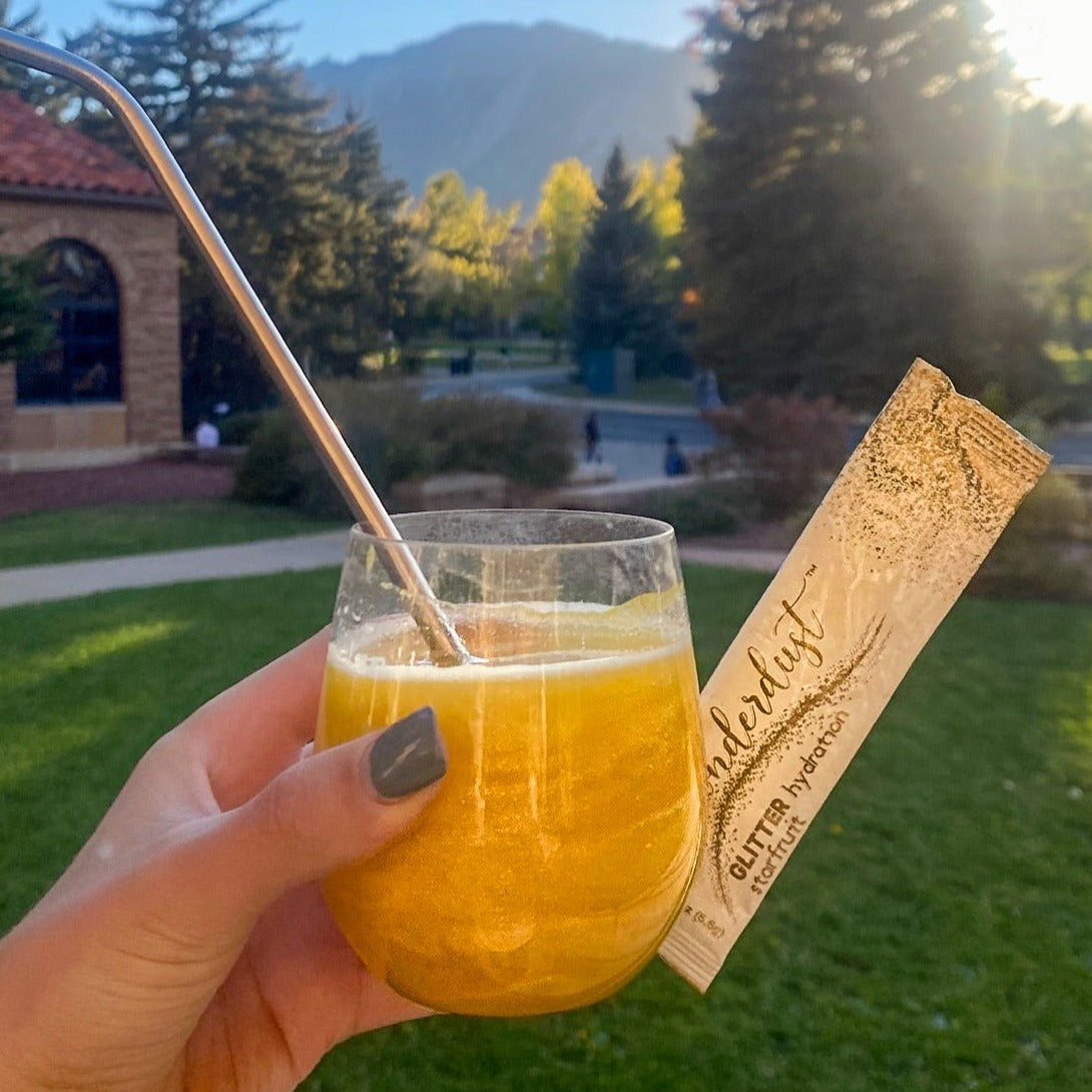 When mixed with still liquids, Wonderdust™ creates a shimmering, effervescent bubbling with an aroma giving the liquid it is poured into an exciting sparkling experience. Each pack is specifically designed with flavor, electrolytes, and coloring, created to enhance your experience and supplement your daily hydration. Due to the effervescent bubbling, the glitter should not settle to the bottom until the bubbling reaction is finished. When it settles to the bottom, simply swirl and watch the magic unfold all over again!